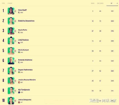 我们再来关注一项女网数据榜。在2025赛季WTA巡回赛中,谁的发球双误数最多?TOP10都有谁呢?通过数据汇总,美国一姐高芙以431个双误高居榜首。俄罗斯人亚历山德洛娃以300个双误排在次席,美国小黑帕克斯排在第三位,双误数是296个。排在第四到第十位的分别是捷克人诺斯科娃(289个)、乌克兰人科斯秋克(261个)、美国人阿尼西莫娃(260个)、乌克兰人雅斯特雷姆斯卡(260个)、西班牙人博萨斯(244个)、澳洲人汤姆贾诺维奇(241个)和拉脱维亚人奥斯塔彭科(241个)。