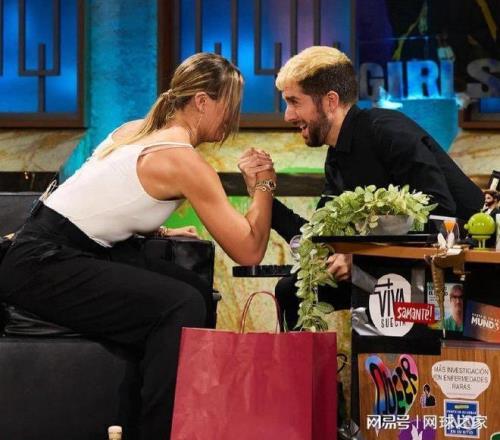 最后来猜一猜认一认。下面这张图片是一位女球员和朋友扳手腕。不作提示,您能认出她是谁吗?